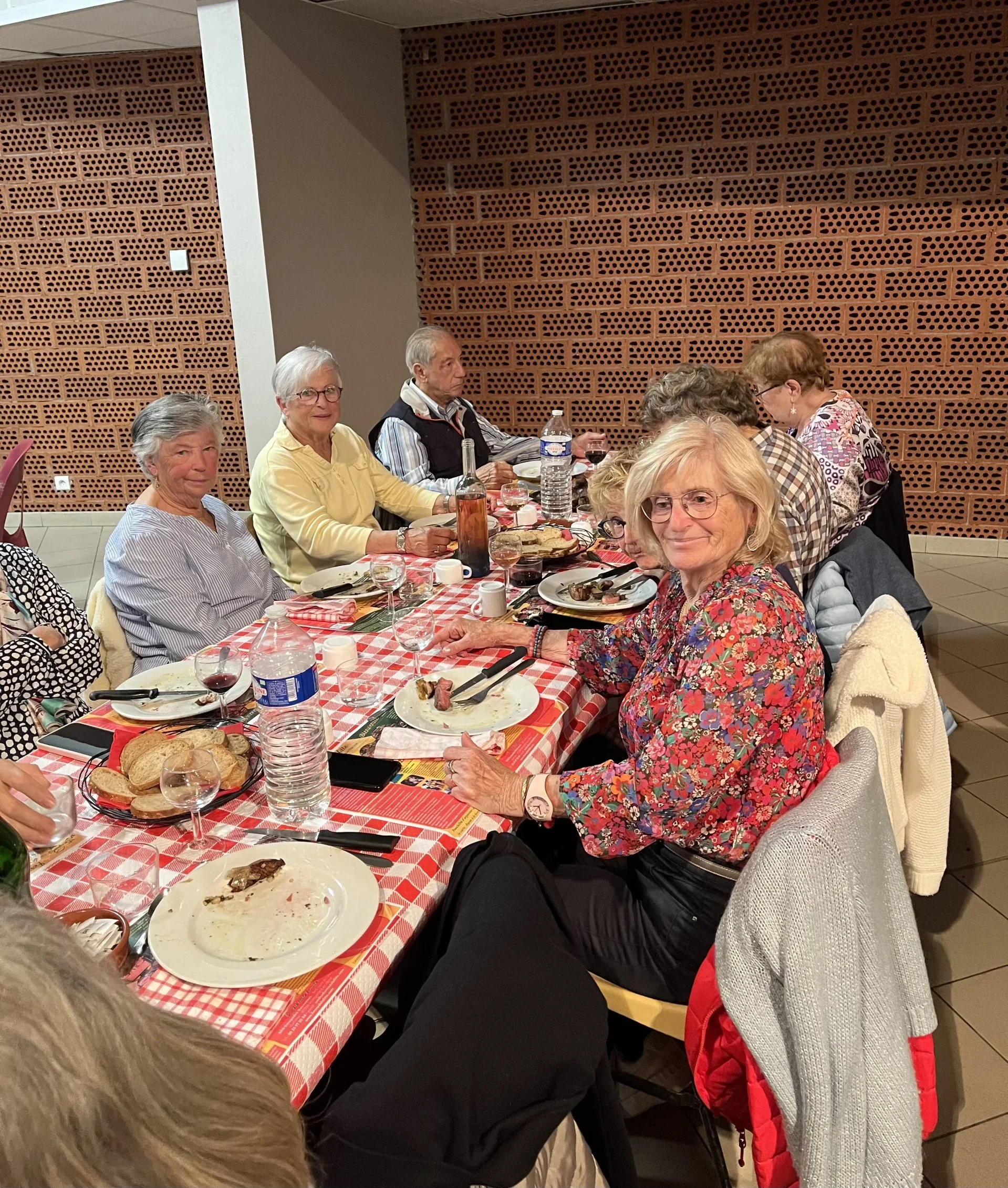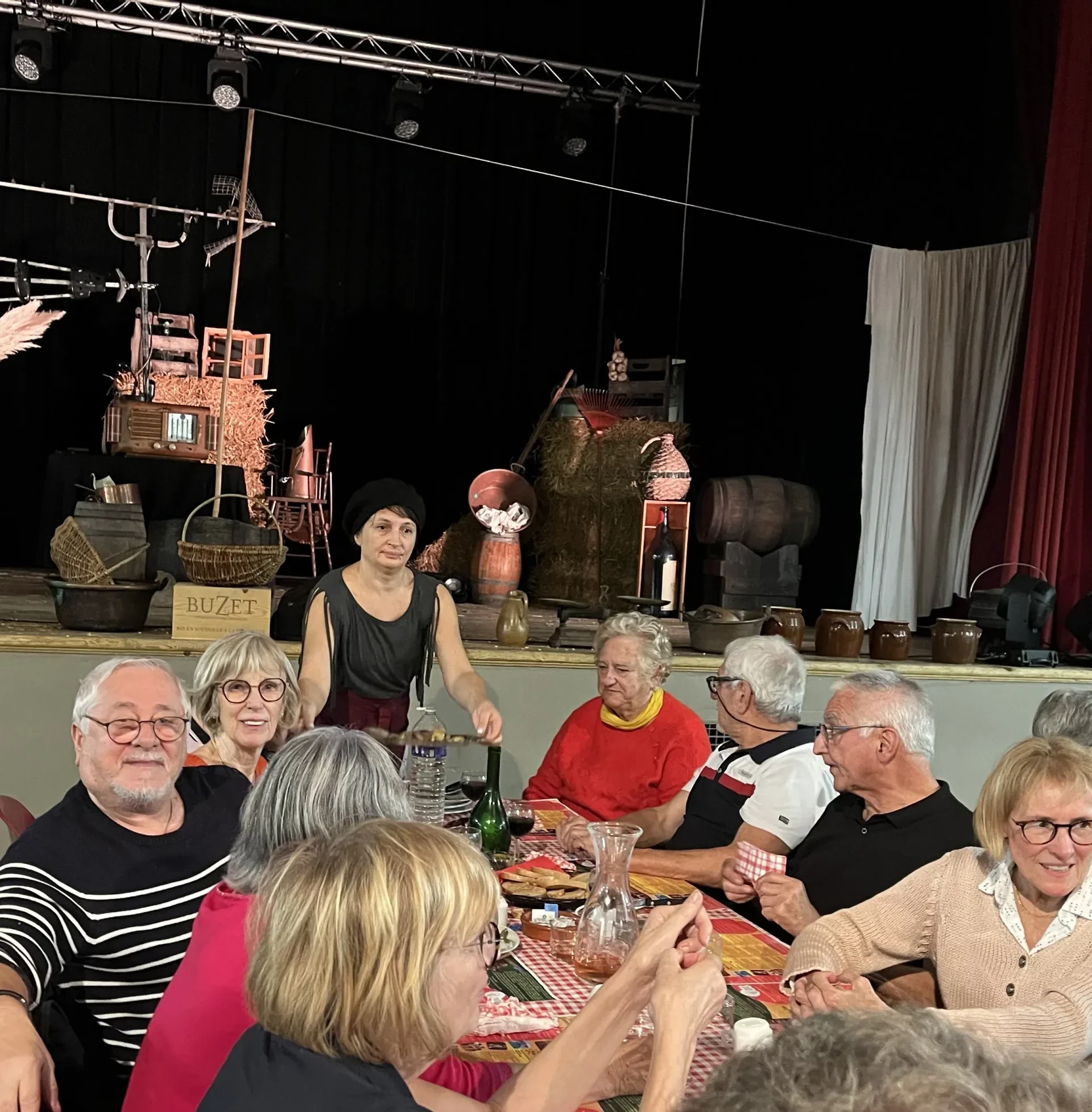 Garbure Théâtrale du 08/11/2024. Nous sommes partis de bonne heure et de bonne humeur, 95 convives répartis en deux bus. Le programme de la journée nous promettait, humour, rire, partage et gastronomie Après 2h30 de route, nous avons été accueillis avec un casse-croûte à la Ferme Laffitte. Après, nous sommes partis pour une visite commentée par deux guides, passionnés par la Bastide de Vianne. Ensuite nous avons rejoint la salle Jourdain de l'Isle à Vianne pour savourer un excellent repas, bien arrosé ( avec modération), accompagné d'un spectacle de qualité tout en humour et finesse. Retour vers Biscarrosse, tous heureux d'avoir passé une bonne journée. Christine et Martine G, accompagnatrices et responsables des deux groupes.
